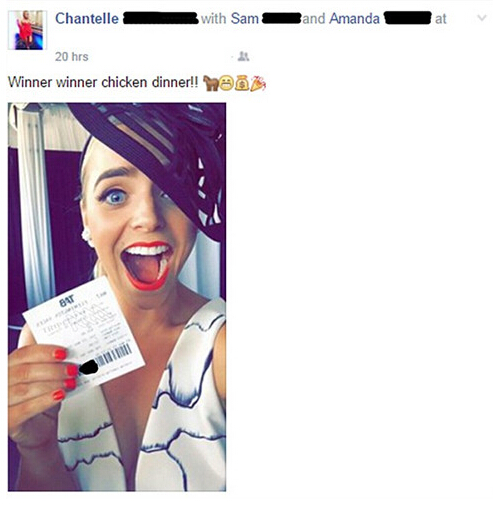 報道稱,日前仙黛兒和朋友到馬場參加墨爾本杯賽時,將20澳元投注在一匹賠率為1比100的冷門馬上,沒想到仙黛兒竟神奇地贏了825澳元的獎金。首次賭馬的仙黛兒高興得不得了,便和彩票自拍合影,并將照片上傳到了“臉書”上。