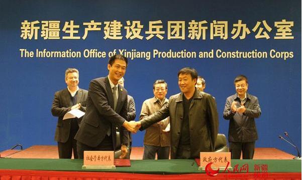 太平洋建設董事局副主席張成(左)和兵團第二師37團副團長張志勇在簽約后握手。