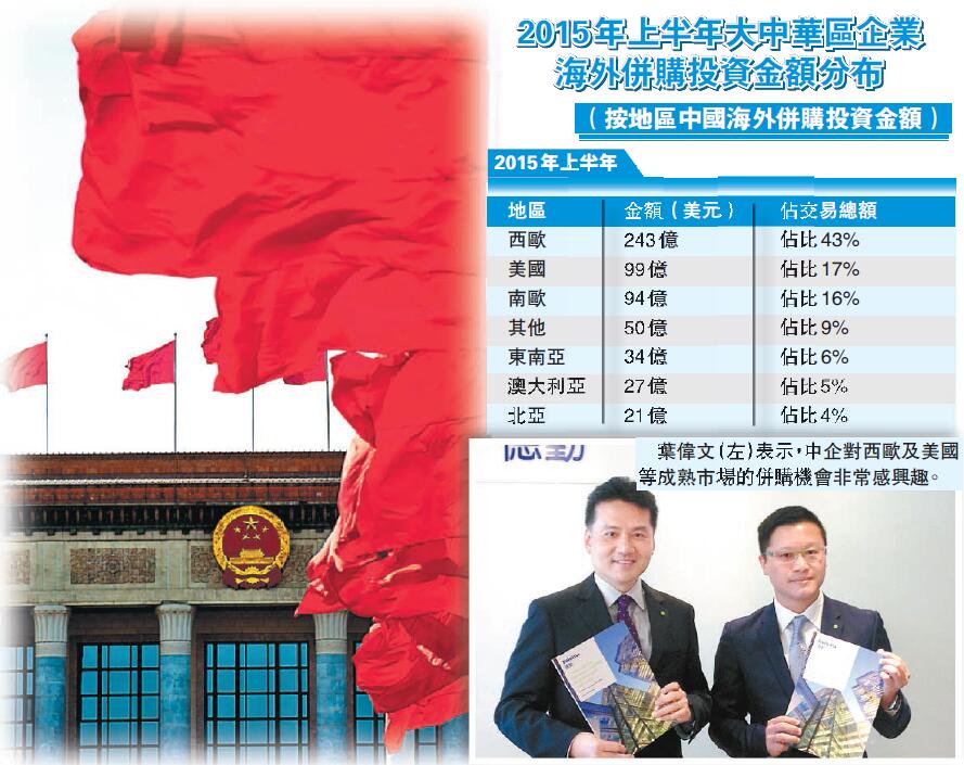上半年位於西歐的併購交易金額錄得243億美元,按年升137%,佔海外併購交易總金額的43%。雖然歐債危機前景未明,當地經濟未有起色,但當地企業因而售價較低,加上歐元匯價屬歷史低位,中國投資者對中西歐企業興趣較大。葉偉文形容買西歐企業是「雙平」,名牌雲集的消費品行業和德國製造業都深受投資者青睞。