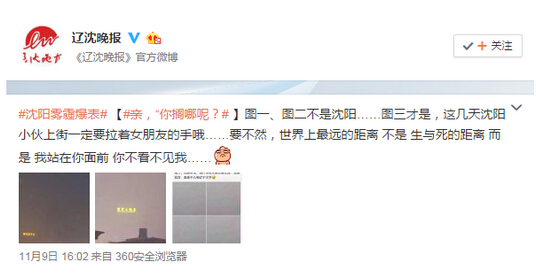 參考消息網11月11日報道 英媒稱,冬天來了,中國大部分地區燃燒煤炭的公共采暖系統開啟了——從而發生了霧霾,這使東北城市沈陽的一家報紙建議讀者緊緊抓住女朋友的手,以免她在霧霾中走失。