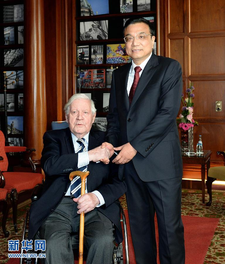 2013年5月27日,中國國務院總理李克強在柏林會見施密特。李克強說,施密特先生是中國人民的老朋友,也是中德關系的開拓者和推動者。你作為有世界眼光的資深政治家,不僅為中德關系發展發揮了特殊作用,而且為推動歐洲一體化進程作出了重要貢獻,中方表示高度贊賞。施密特感謝李克強會見,表示中國經濟社會發展取得的巨大成就令人欽佩。