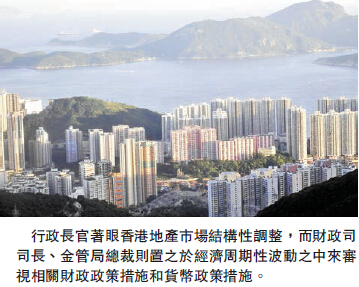 香港缺乏宏觀經濟政策工具。因為聯系匯率制,香港沒有能動的貨幣政策來調控通貨膨脹或緊縮,貨幣政策也不能用於刺激增長或壓抑經濟過熱。受制於「量入為出,維持財政平衡」的約束,特區政府的財政政策只能因應經濟周期性起伏,很難用來應對經濟結構性變化。行政長官和財政司司長、金管局總裁在對待香港地產市場的政策考慮如果有所差異,那麼,主要原因就在於,行政長官著眼香港地產市場結構性調整,而財政司司長、金管局總裁不能不將香港地產市場置於經濟周期性波動之中,來審視相關財政政策措施和貨幣政策措施。