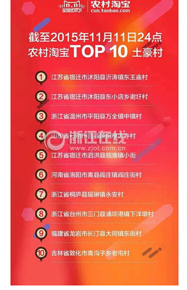 排在榜首的是江蘇省宿遷市沐陽縣沂濤鎮王廟村,同樣來自沐陽縣的東小店鄉謝圩村排在第二,浙江省溫州市平陽縣萬全鎮中鎮村位居第三。值得一提的是,中鎮村成交的一輛價值50多萬的保時捷Macan越野車,是農村淘寶在雙11當天的單筆最大交易。