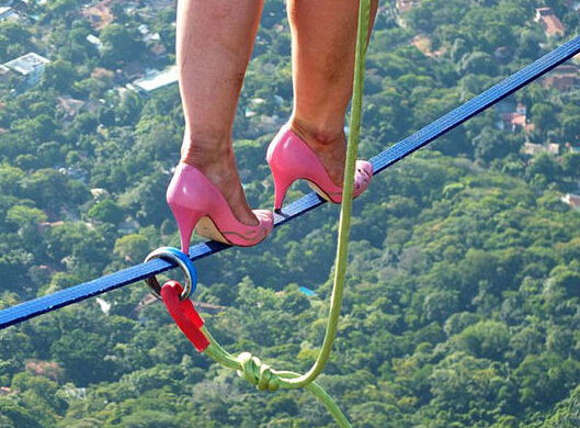 美女子穿“恨天高”840米高空走钢丝