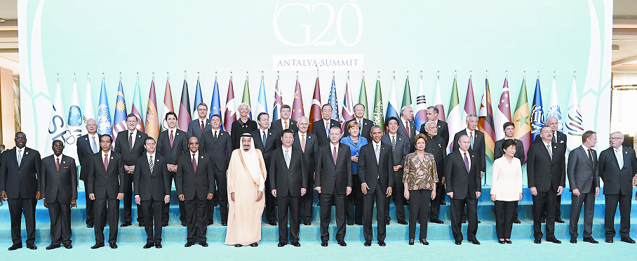 15日,二十国集团领导人第十次峰会在土耳其安塔利亚举行。国家主席习近平出席并发表题为《创新增长路径 共享发展成果》的重要讲话,强调二十国集团要加强宏观经济政策沟通和协调,推动改革创新,构建开放型世界经济,落实2030年可持续发展议程。