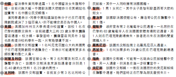 摩洛哥該國駐法國使館公布,摩洛哥公民在襲擊中1死1傷。