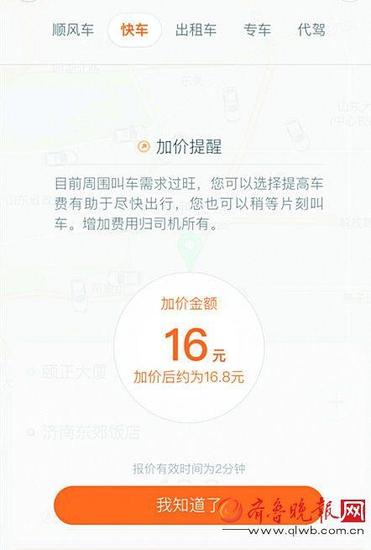 “我打了一輛滴滴快車,輸入目的地後,出現了一個加價提醒,需要我額外支付16元。”趙先生說。記者看到,趙先生手機上的加價提醒寫道:目前周圍叫車需求過旺,您可以選擇提高車費有助於盡快出行,您也可以稍等片刻叫車。增加費用歸司機所有,加價金額為16元。