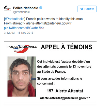 法国警方遂照片发布了一条声明称:“该男子在法兰西体育场附近引爆炸弹身亡。如果您知道关于该名男子的信息,请联系我们。”