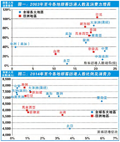 陸客確實為香港經濟出了不少力,其他旅客又如何?撇除內地,由2003年沙士期計起,圖一見到,來自中東、東南亞及中南美的旅客增長最為強勁,例如中東旅客在2003年每年只有8萬多人次,但2014年已經上升至18萬人多,中南美洲旅客亦由2003年的7萬多上升至現時約22萬人次,其他如印尼及泰國等東南亞旅客亦有不俗增長。而且,以東南亞為首的旅客,在過去十多年間,在港消費的金額亦已大幅提升。以印尼為例,2003年人均在港消費只約3523港元,但2014年已經上升至7143港元,升幅有一倍多。就算以整個東南亞計算,在港消費力於十多年亦升近六成。由此可見,除內地旅客外,來自其他新興國家的旅客亦是撐起香港旅遊業的一大動力。