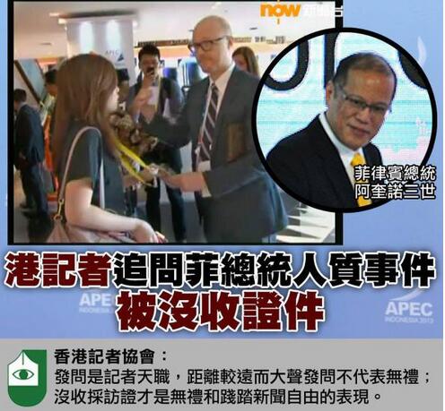 香港新闻行政人员协会7日发表声明指出,记者当时向阿基诺三世提问属正常的采访工作,对这次事件表示遗憾及震惊,并已正式去信亚太经合组织,要求主办方实时交还记者证。香港记者协会7日再发表声明,称对这次事件感到震惊,对此予以谴责。