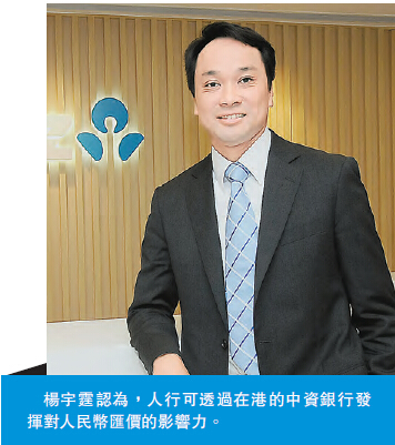 澳新銀行高級經濟師楊宇霆向本報指出,香港擁有不少中資銀行,人行可透過在港的中資銀行發揮對人民幣匯價的影響力。星展銀行(香港)財資市場部(大中華)董事總經理王良享亦稱,不排除人行為了讓離岸人民幣匯價回復穩定,在香港作出干預,并強調此舉屬「合情、合理、合法」。楊宇霆稱,中資銀行一向在海外為人民幣擔當「維穩」角色;人民幣離岸匯價近日回穩,是中資銀行「維穩」所致。他續指,CNH波動期間,市場出現投機意欲,當局透過中資銀行在港的工作,減輕了人民幣在境外市場的貶值壓力。