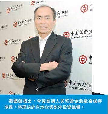 國家主席習近平提出劃時代的「一帶一路」戰略概念,中國內地企業早為走進世界摩拳擦掌。今年頭9個月內地投資者合共對5162家境外企業進行非金融類直接投資,累計實現金額5389億元人民幣,同比增長16.5%,當中不少是經過香港才出去的。長線而言,市場對離岸人民幣資金的需求增加,本港不僅將擴大人民幣資金池,CNH亦可憑藉香港對人民幣的需求,而穩定下來。香港能否在穩定人民幣匯價中扮演積極角色,與人民幣業務容量有極大關系。中銀香港(2388)發展規劃部經濟及政策研究主管謝國梁受訪時指出,隨人民幣單邊升值預期改變,香港傳統人民幣業務已面臨樽頸,今后香港人民幣資金池能否保持增長,將取決內地企業對外投資總量。