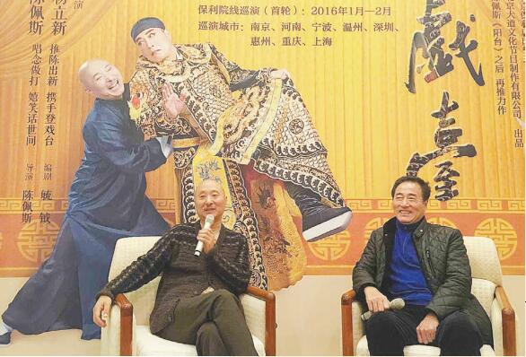 11月18日10點30分,在北京保利劇院舉行了著名喜劇表演藝術家陳佩斯擔當導演、并攜手楊立新共同主演的年代喜劇《戲臺》的新聞發布會,向全國媒體推介這部「零瑕疵」的喜劇作品,并宣布《戲臺》將於2016年1月到2月在上海、南京、深圳、重慶等8個城市進行演出。該劇是由毓鉞編劇、陳佩斯導演、陳佩斯與楊立新攜手主演的一部年代喜劇,講述的是民國時期軍閥混戰背景下,發生在某個戲班后臺的故事。該劇由大道文化與北京保利劇院聯手打造,深圳將於1月22日-24日在保利劇院上演3場。