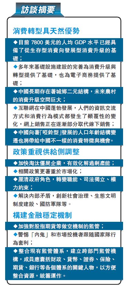 陆挺:中国的消费转型具有天然的优势:其一,目前7800美元的人均GDP水平已经具备了从生存型消费向发展型消费升级的基础;其二,多年来基础设施建设的完善为消费升级与转型提供了基础,也为电子商务提供了基础;其三,中国长期存在着城乡二元结构,未来农村的消费升级空间巨大;其四,互联网在中国蓬勃发展,人们的资讯交流方式和消费行为模式都发生了颠覆性的变化,网上销售正在逐渐部分取代线下销售;其五,中国向着「哑铃型」发展的人口年龄结构变迁也将带给中国不一样的消费特徵与机会。