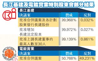 长建及电能昨晚公布,出席电能实业法院指令会议的独立股东当中,多达49.23%的股东反对合倂议案,只有50.77%的股东投赞成票。由於未能达到最少75%独立股东赞成的门槛,故即使合倂议案获长建股东大比数通过,在近半数电能股东反对下,长建亦未能如愿合倂电能。根据现行规定,议案被否决後,长建需在一年之後,方能再次提出合倂方案。
