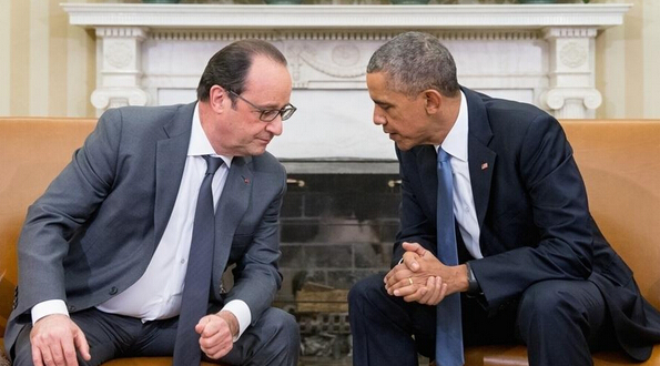 當地時間2015年11月24日,美國華盛頓,美國總統奧巴馬會晤到訪的法國總統奧朗德,討論反恐事宜。(Andrew Harnik/東方IC )