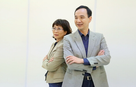 中国国民党“大选”参选人朱立伦(左)和副手王如玄(右)23日下午拍定装照,鲜少化妆的王如玄要求自然,朱立伦则很有经验带领王如玄摆POSE,两人共拍了3套装装,图为休闲风西装照。