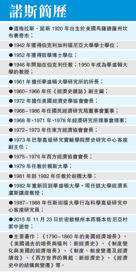 诺斯的主要贡献是新经济史,他开创性地运用新古典经济学和经济计量学来研究经济史问题,建立了包括产权理论、国家理论和意识形态理论在内的「制度变迁理论」。他与1991年诺贝尔经济学奖获得者罗纳德科斯一起,成为新制度经济学的主要奠基人。复旦大学经济学院院长张军向本报表示:「诺斯是杰出的经济史学家,他的理论着作主要是从经济史的角度来研究经济的演变。诺斯是继约翰罗吉斯康芒斯之后的制度学派的经济学家,他从上世纪60年代起把制度与经济发展之间的问题重新提出来,主要基於对欧洲和美国经济史的量化研究,坚持强调制度的重要性。诺斯本身是史学家,在政治学和经济学也有很深的造诣,他注意到当时大多数经济学家一般都不去关心或考虑制度问题。自他之后,经济史的量化研究工作慢慢成为一个学潮,外界重新捡起关於制度与经济发展关系的脉络。」