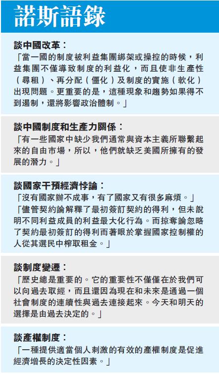 对於中国面临的问题,诺斯本人於2002年在上海也提出过自己的见解。诺斯认为,必须设计一种制度来规范参与者,让他们明确自己的收益是什麽,使他们趋於选择合作而不是欺诈。对於一个转型的经济来说,将来肯定要面临的更根本的问题是,如何使政治体制的变革能以较低的成本来保证个人契约的有效实施。中国经济经历了一场巨大的变革,取得了非凡的成就,「但是我认为你们还没有真正解决好个人之间的更有效的交易的问题。」诺斯说。
