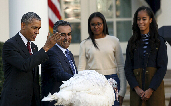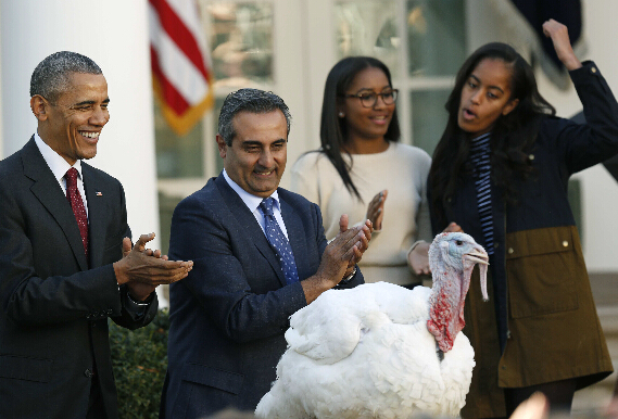 奥巴马与女儿笑着观赏这只叫“安倍”(Abe)的特赦火鸡。