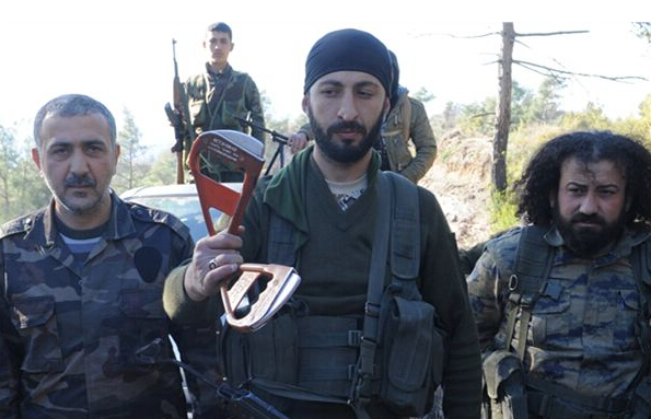 圖為敘利亞北部一支土庫曼武裝的指揮官(中)手拿一個把手,據稱來自俄羅斯飛行員所用的降落傘。(新華/路透)