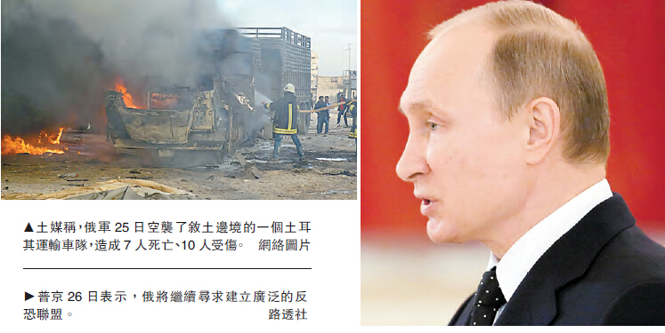 據土耳其國營通信社安納多盧通信社26日報道,當地時間25日,俄軍空襲了敘土邊境的一個土耳其運輸車隊,該車隊當時正在敘利亞阿勒頗省邊境城鎮阿扎茲附近前進,是一個救援車隊。而當地激進分子宣布了同樣的消息。與此同時,俄軍方對土耳其與敘利亞邊境地帶進行了密集轟炸。俄總統普京26日警告,以后若再發生擊落俄戰機的類似情況,俄必報復。