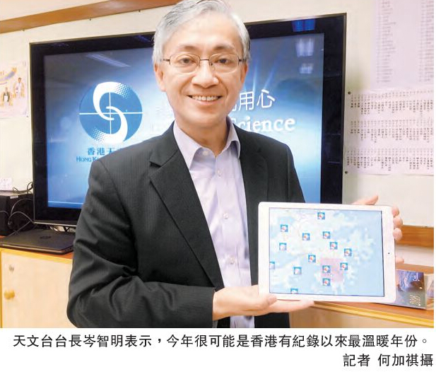 岑智明称,今年夏季特别热,主要是6月副热带高压脊偏强、南海北部水温偏高,引致天气异常炎热;至於今年秋季同样是副热带高压脊偏强,11月东北季候风偏弱,导致秋季温度偏高。在全球变暖化及本地城市化的影响下,香港夏、秋季气温有显着的长期上升趋势,而在厄尔尼诺现象下,出现偏暖的机会略高於「正常情况」。