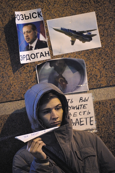 俄羅斯民眾在土耳其駐俄使館前,抗議土耳其擊落俄戰機。