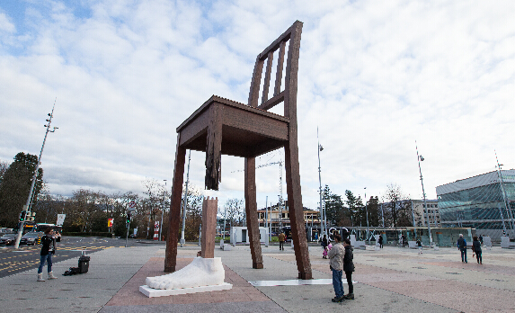 为纪念《渥太华禁雷公约》缔约国会议当天在日内瓦召开,这把椅子被续上了“新肢”。这把矗立在日内瓦联合国广场的巨大断腿椅子,是瑞士着名雕塑家丹尼尔·伯塞特1997年为庆祝《渥太华禁雷公约》签署而创作的。