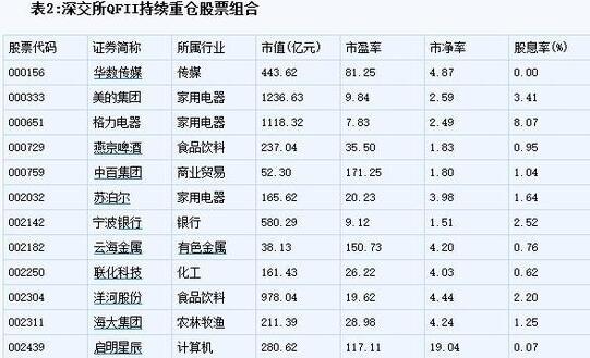 投資主線之三:QFII 在深交所持續重倉標的。平安證券統計了2014年第四季度至2015年第三季度QFII在深交所的重倉標的。同時,按照QFII持有市值占該股自由流通市值的比例比高到低排序,之后選出每個季度QFII持倉占比排名前五十位的個股。最后,在四個季度中均能排進前50名的個股,可以看作是QFII特別偏好的個股組合,這些股票有望在深港通開通后繼續得到QFII的青睞。(見表2)