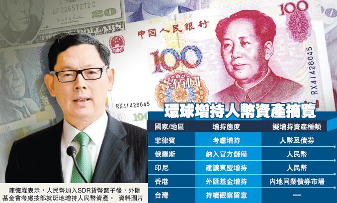【香港商報网訊】記者劉佳玲報道:國際貨幣基金組織(IMF)宣布將人民幣納入特別提款權(SDR)後,環球央行與主權基金紛紛開腔表態樂意增持更多人民幣資產,香港當然不會例外。本港金管局總裁陳德霖昨在內地開腔,外匯基金正在考慮是否按部就班地增持更多的人民幣資產。