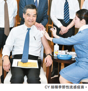 CY昨日联同财经事务及库务局局长陈家强、运输及房屋局局长张炳良、创新及科技局局长杨伟雄、陈茂波及张建宗等5位局长,齐接种季节性流感疫苗,藉此鼓励市民及早接种。