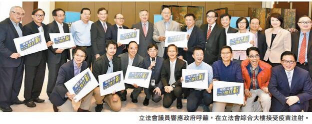 昨日27位立法会议员亦在高永文陪同下,於立法会接种疫苗,包括民建联主席李慧攌、副主席陈克勤、前主席谭耀宗、何俊贤、陈恒镔、梁志祥、黄定光、自由党议员张宇人、公民党郭家麒、新民党副主席田北辰,甚至是人民力量的陈志全及陈伟业等均有到场支持,未接种的接种,已接种的则拍照支持,整个行动共有27位议员参与;不少议员希望食卫局副局长陈肇始「主针」,但她手伤未复元,而已有3年多未亲手「打针」的高永文则为陈伟业与田北辰「打针」,两名议员均大赞高永文手势好,接种过程中没有痛楚。