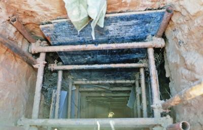 盗洞深达10米,为防止塌陷用钢管木板加固四壁。