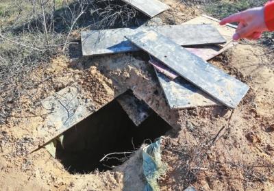 靠北侧的较大土丘顶部,出现了4个盗洞。其中两个较浅,还有一处底部被用钢管和杂物撑起,下部悬空。