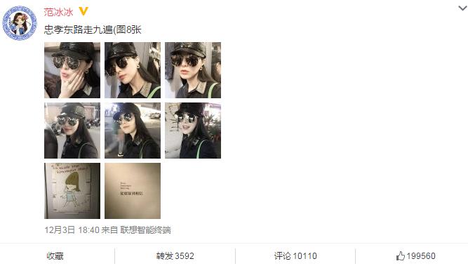 12月3日晚,范冰冰通过微博晒自拍照,照片中,范冰冰戴着时尚黑色鸭舌帽,黑超墨镜遮面,红唇白齿,皮肤白皙,从背影看出,是在大街上,牵手的男人虽然没有出镜,看着应该是男友李晨。