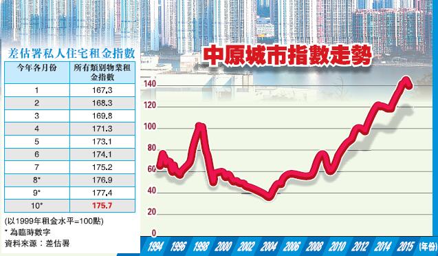 據差估署10月臨時數字,全港私人住宅整體租金指數報175.7點,較九月份跌1.7點,跌幅接近1%,終止連續約1年半升勢。當中,約400平方尺或以下的小型單位,租金按月跌近1%,一千尺以上的大型單位,租金跌約0.5%,反映大型單位租金抗跌力較強。今年首10月累計,私樓租金升幅仍有約累升5.7%,按年則升6.94%,有關升勢明顯較同期本港樓價較為落后。