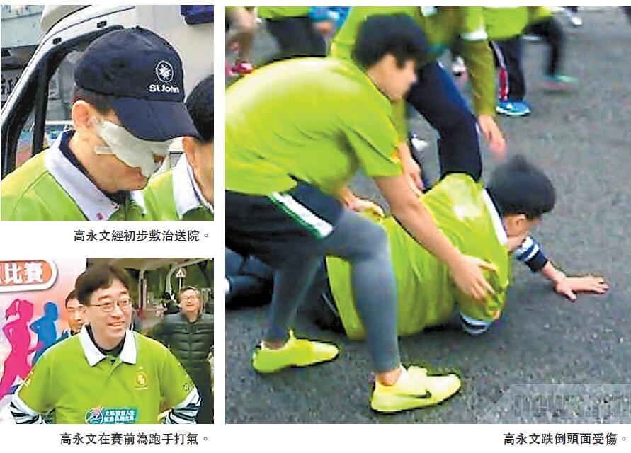 高永文是於昨晨出席上水的「北区丰盛人生健康乐长跑比赛」两公里赛事,但在人群中起步时刚跑了数步,突然有一名小童疑心急冲前,从后方冲向高的前边,却失足绊倒;高永文从他左后方跑至,被倒地的小童绊倒,头面受伤马上流血,眼镜亦飞脱,他双手掩面,尾随的工作人员见状,上前将他搀扶,并带到现场急救站,圣约翰救伤队队员为高急救及包紮,面部和鼻都贴上纱布,再由救护车送往北区医院治理;至於跌倒的小童则马上站起,并无受伤,毋须送院。