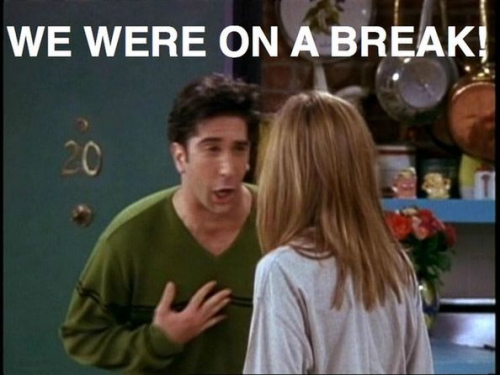 再比如。。罗斯和瑞秋吵架闹分手后转脸和打印店小姑娘滚了床单,事后罗斯竟然一直强调他们俩当时“处于分手状态”(We were on a break!)拜托,这个时间争论是否处于“分手状态”有意义吗?直接道歉好吗!比这更糟糕的是,当瑞秋问他和打印店女孩的滚床单感受的时候,(这是一道送分题好吗!连躲在房门里的钱德勒都知道要适时的撒个小慌。)罗斯的回答,竟然是:Different!