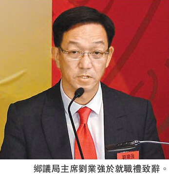 每逢4年选举产生的第34届新界乡议局新一届领导班子,於昨晚7时许举行就职典礼大会,大会奏国歌后进行。新任该局主席刘业强致辞时表示,要以脚踏实地、勤奋努力,希望以务实作风,以工作成绩来与大家分享,同时,希望该局同寅继续发挥团队精神,为新界民众服务。他续强调指出,秉承该局前贤精神,坚持拥护一国两制,港人治港,高度自治;坚持奉行爱国爱港爱乡;坚持支持特区政府以民为本,依法施政;坚持争取新界乡民应有的合法传统权益的原则与立场不变,亦是本届乡议局主席应有和应尽的义务与责任。