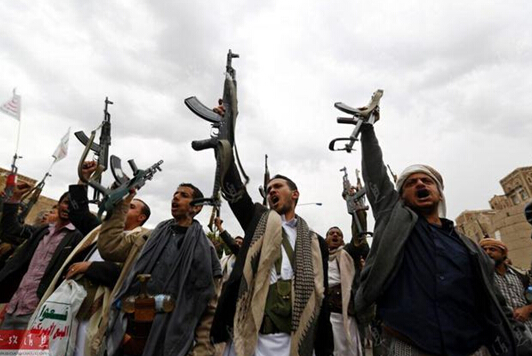 资料图:胡塞武装人员在萨那街头持枪抗议沙特等国的空袭行动