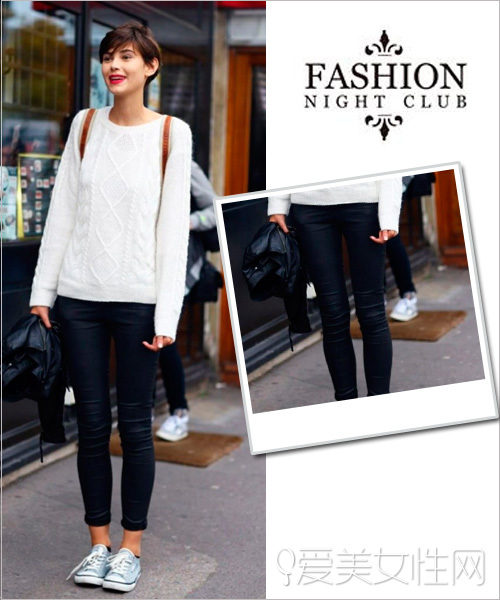 【搭配技巧】:白色毛衣+黑色打底裤+帆布鞋