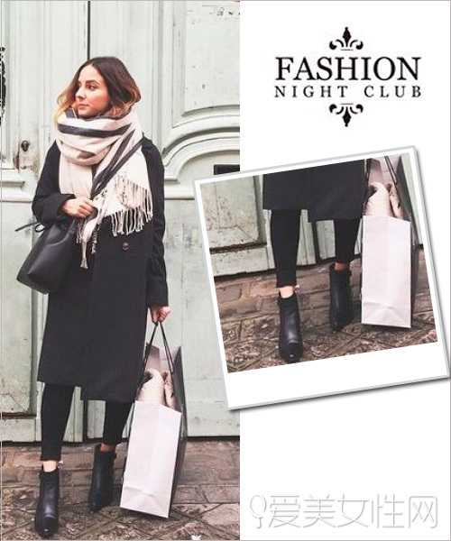 【搭配技巧】:黑色呢子外套+黑色打底裤+黑色短靴