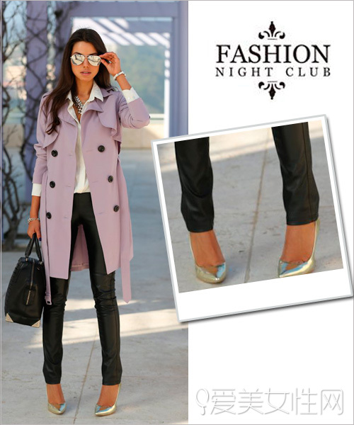 【搭配技巧】:白色衬衫+粉色风衣外套+黑色打底裤+银色尖头高跟鞋