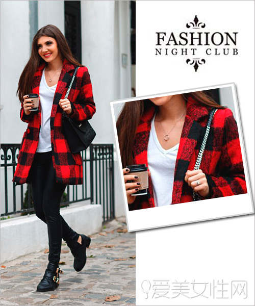 【小编点评】:白色T恤搭配红色格子呢子外套,温暖又时髦,再配上一双黑色短靴和一条黑色打底裤,十分显瘦。