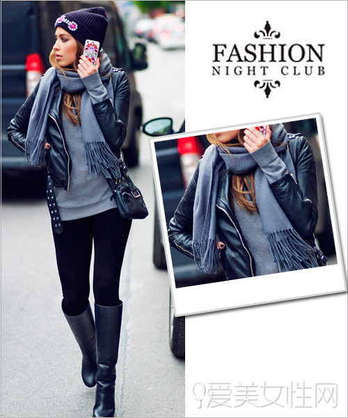 【搭配技巧】:灰色针织衫+皮衣外套+黑色打底裤+黑色中靴