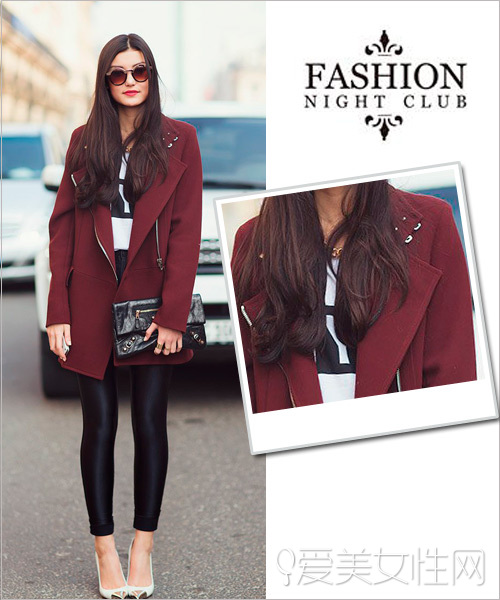 【搭配技巧】:拼色针织衫+黑色打底裤+红色呢子外套+白色高跟鞋
