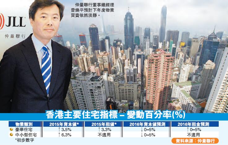 【香港商報網訊】記者曾展榮報道:2015年快將結束,機構陸續就明年樓市作出預測。當中,仲量聯行報告認為,本港明年樓價存在下行風險,惟大幅下跌機會不大,全年中小型住宅與豪宅樓價最差將跌5%。仲量聯行董事總經理曾煥平表示,在二手低迷拖累下,明年整體樓市成交難見復蘇,全年可能僅錄3萬宗水平,遠低於樓市高峰時的逾10萬宗水平。
