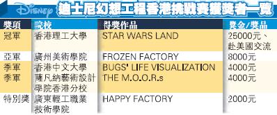 【香港商報網訊】記者何加祺報道:香港迪士尼樂園早前舉行第5屆「迪士尼幻想工程香港挑戰賽」,有超過200名來自本港及內地的大專院校學生參賽,兩地均有隊伍進入最后10強。獲得冠軍的香港理工大學產品分析及工程設計學的4名學生,以經典電影《星球大戰》作主題,讓旅客代入戲中的主角,跟隨樂園中的電影場面逃亡。他們可於明年1月到美國跟迪士尼總部幻想工程人員進行交流。