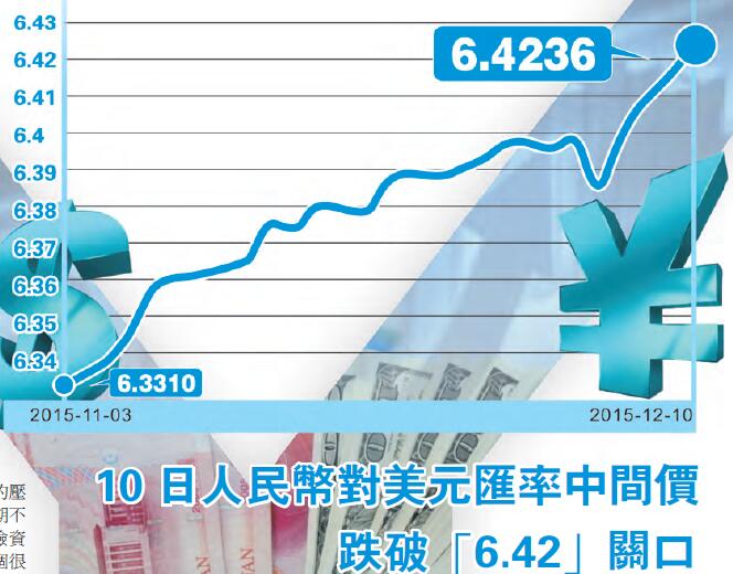 人币入篮后最引人关注的莫过於近期人币的汇率走势了。自11月30日入篮以来,人民币已经累计下跌0.5%。最近四天,人民币走势呈现明显的阶梯型下跌走势,每日跌逾百点。昨日更创下自11月2日来最大跌幅,在岸人民币对美元再跌155点,报6.4430。